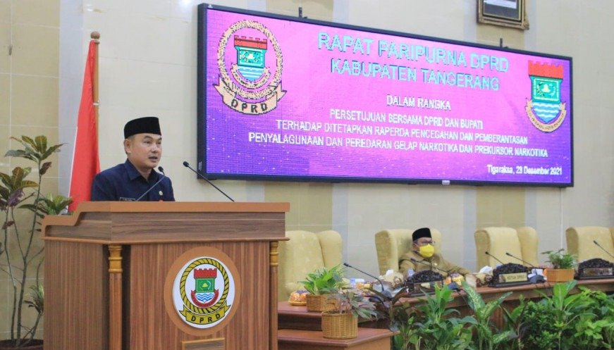 TANGERANG, – Wakil Bupati Tangerang H. Mad Romli mengapresiasi Dewan Perwakilan Rakyat Daerah (DPRD) Kabupaten Tangerang, Hal itu, karena Rancangan Peraturan Daerah (Raperda) Pencegahan dan Pemberantasan Penyalahgunaan dan Peredaran Gelap Narkotika dan Prekursor Narkotika disetujui oleh DPRD Kabupaten Tangerang. “Syukur Alhamdulillah, pihak legislatif bersama jajaran eksekutif pada akhirnya mencapai hasil seperti yang kita harapkan bersama. Atas nama jajaran eksekutif, saya menyampaikan terima kasih yang sedalam-dalamnya kepada semua pihak terutama kepada seluruh fraksi DPRD Kabupaten Tangerang yang telah memberikan tanggapan, pandangan, saran, koreksi, serta masukan atas usulan Raperda yang kami sampaikan”, kata Mad Romli saat menghadiri Rapat Paripurna Persetujuan Bersama DPRD dan Bupati terkait Raperda di Ruang Rapat Paripurna DPRD Kabupaten Tangerang, Kamis (23/12/21).