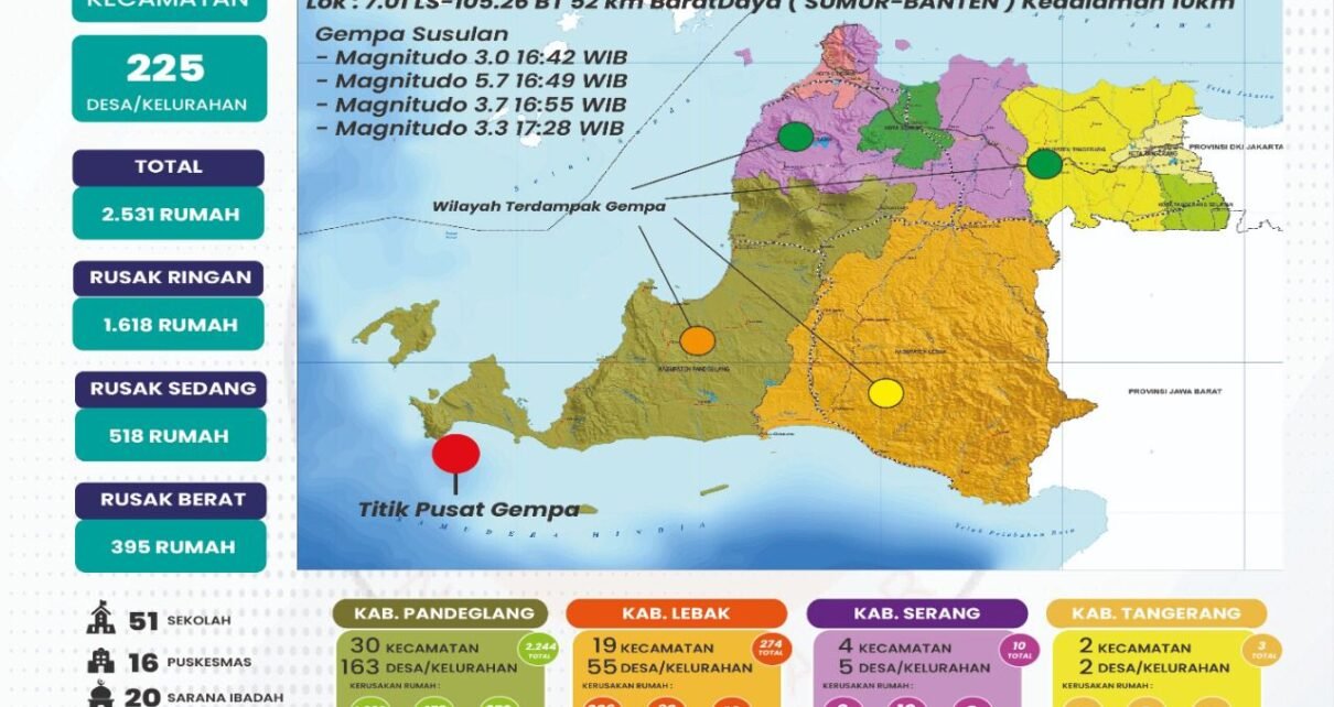 Berdasarkan data hasil update Badan Penanggulangan Bencana Daerah (BPBD) Provinsi Banten hingga hari Senin pukul 09.00 WIB (17/1/2022), 4 wilayah di Provinsi Banten terdampak gempa. Sebanyak 225 desa/kelurahan di 55 Kecamatan yang tersebar di Kabupaten Pandeglang, Kabupaten Lebak, Kabupaten Serang dan Kabupaten Tangerang terdampak gempa.