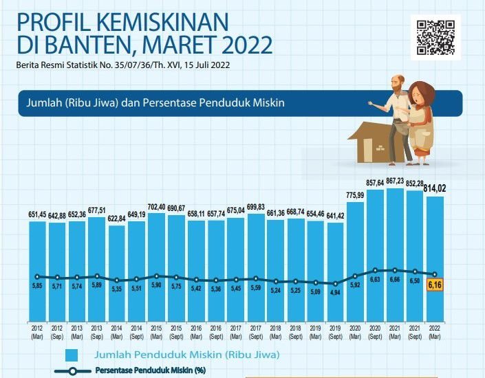 Berdasarkan Berita Resmi Statistik (BRS) Badan Pusat Statistik (BPS) Provinsi Banten Nomor : 35/07/36/Th. XVI, 15 Juli 2022, jumlah penduduk miskin pada Maret 2022 sebesar 814,02 ribu orang. Turun 38,26 ribu orang terhadap September 2021 dan menurun 53,21 ribu orang terhadap Maret 2021. Persentase penduduk miskin di Provinsi Banten pada Maret 2022 sebesar 6,16 persen. Turun 0,34 poin persen poin terhadap September 2021 dan juga menurun 0,50 persen poin terhadap Maret 2021.