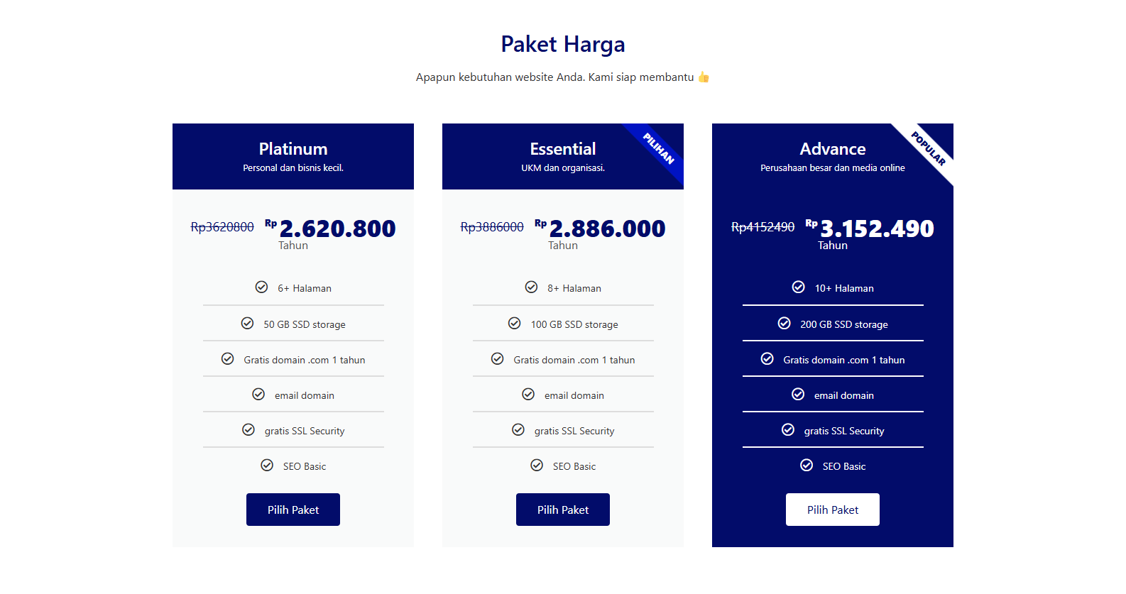 - Paket Dasar: Rp 2.620.800 (Cocok untuk landing page atau website portofolio)